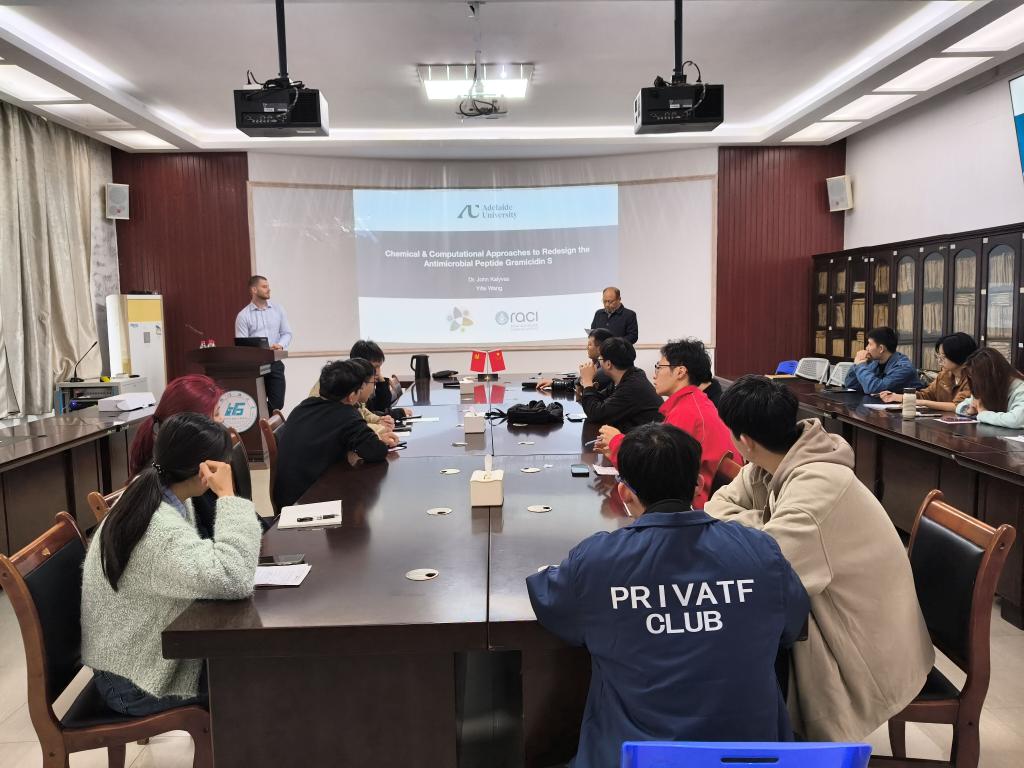 3月25日上午,由PC加拿大28 主办的学术讲座在雁山校区12217会议室顺利举行。来自澳大利亚阿德莱德大学的John Kalyvas博士与王亦非博士应邀作了题为“化学与AI策略从头设计抗菌肽短杆菌肽S”的精彩报告。PC加拿大28 相关专业师生到场聆听,讲座由PC加拿大28 喻敬贤教授主持。 讲座伊始,王亦非博士首先介绍了当前全球公共卫生领域面临的严峻挑战——抗生素耐药性。他指出,多药耐药的“ESKAPE”病原体正严重削弱现有疗法的有效性,对常规医疗应用构成重大威胁。在此背景下,研究团队聚焦于环状抗菌肽短杆菌肽S这一具有强效抗菌活性但受限于溶血毒性的经典分子,探索其向更安全抗生素骨架转化的可行路径。John Kalyvas博士围绕环状肽及肽拟体的设计合成展开深入讲解。他介绍了研究团队在开发针对多药耐药细菌感染的新型抗生素方面的系列工作,重点展示了通过构象受限的宏环肽工程克服传统抗生素局限性的创新策略。 在互动交流环节,与会师生围绕光控抗菌肽的响应机制、机器学习模型的特征选择策略、环状肽的合成挑战等热点问题与两位主讲人展开了热烈讨论。两位博士结合自身研究经验,逐一进行了细致解答,现场学术氛围浓厚。 讲座现场 (一审:马文硕;二审:喻敬贤;三审:潘宏程)